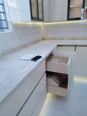 Glossy Grey Modular Kitchen – White Acrylic Corian/Staron Countertops – Asa